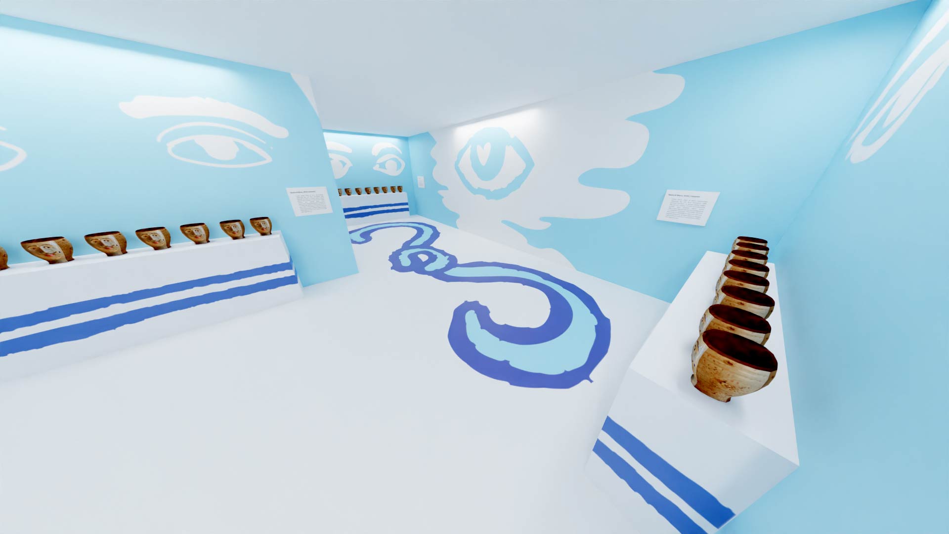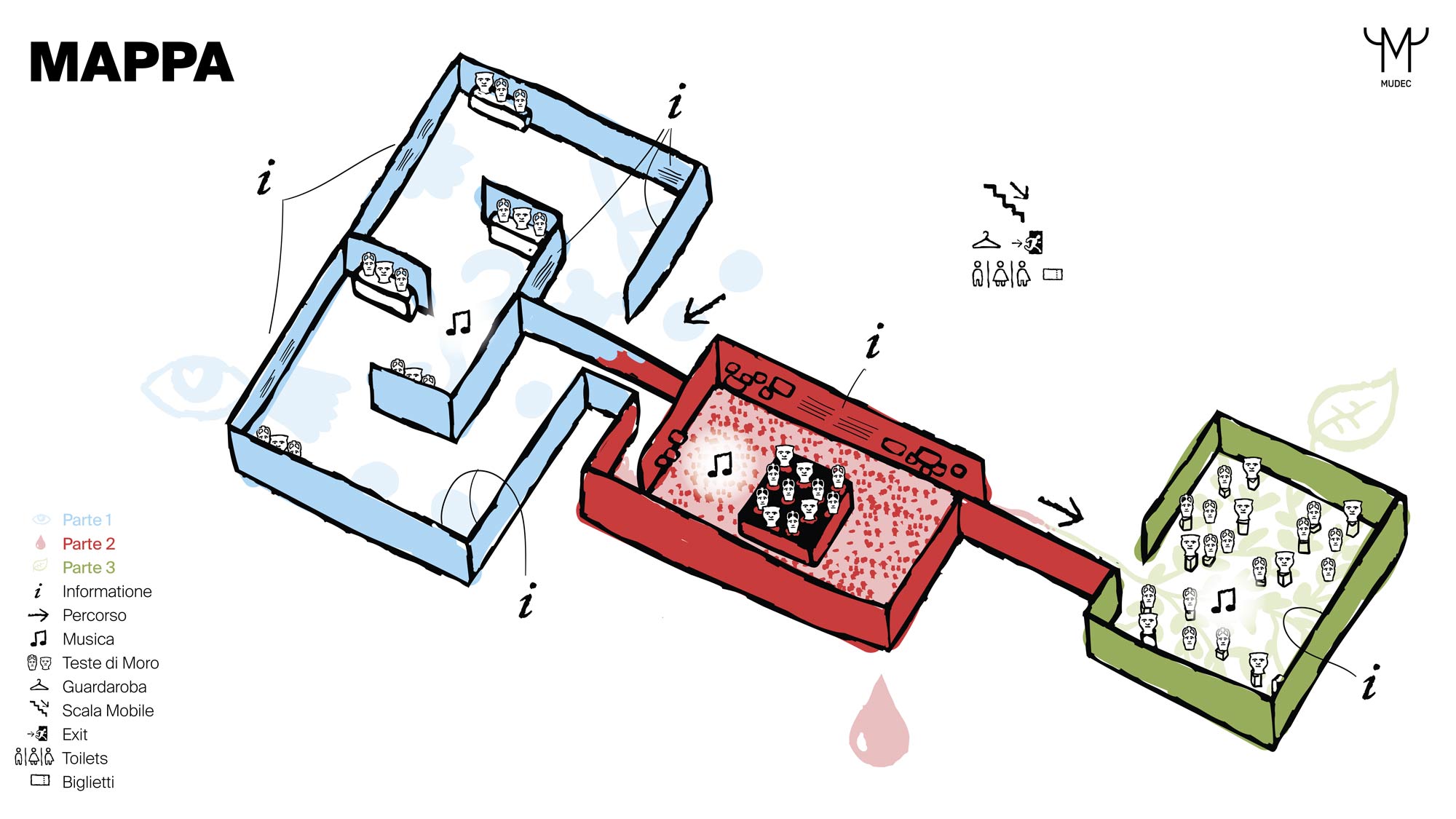 Diese drei Akte strukturieren auch die drei Bereiche der Ausstellung. Jeder Raum wird zusätzlich durch eigens komponierte Musik atmosphärisch untermalt.