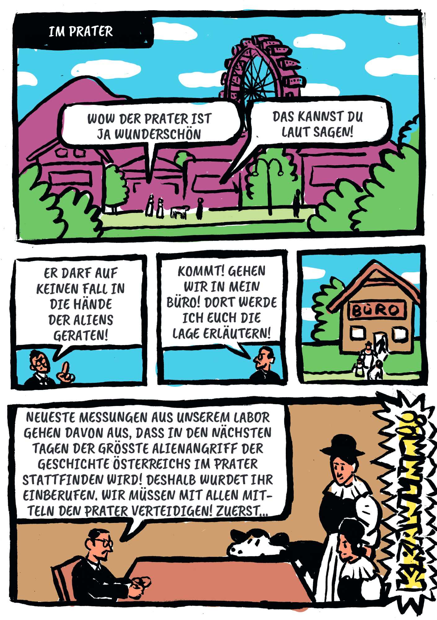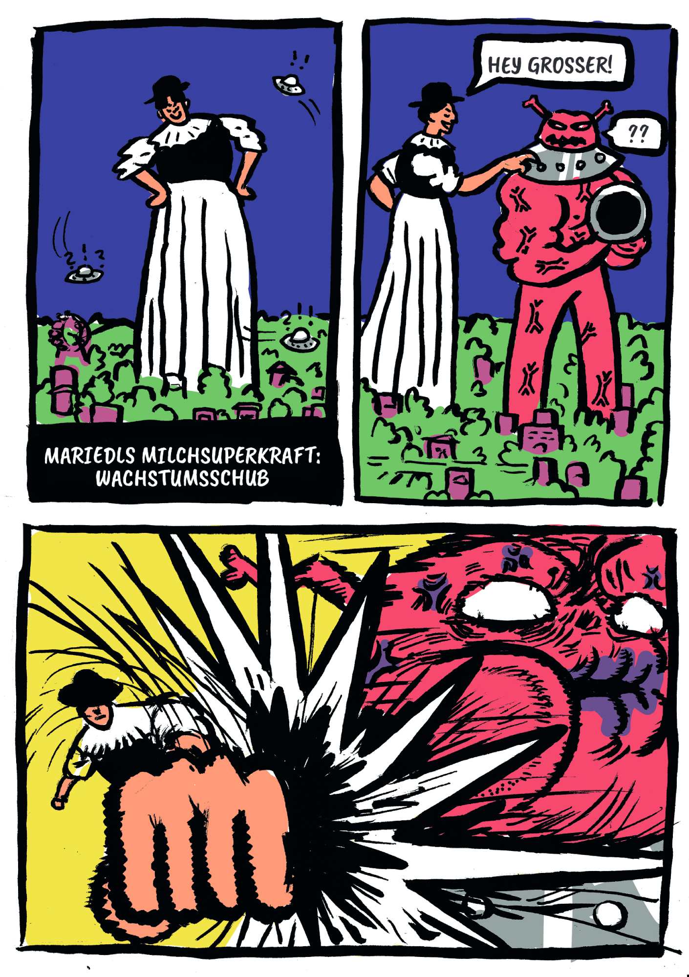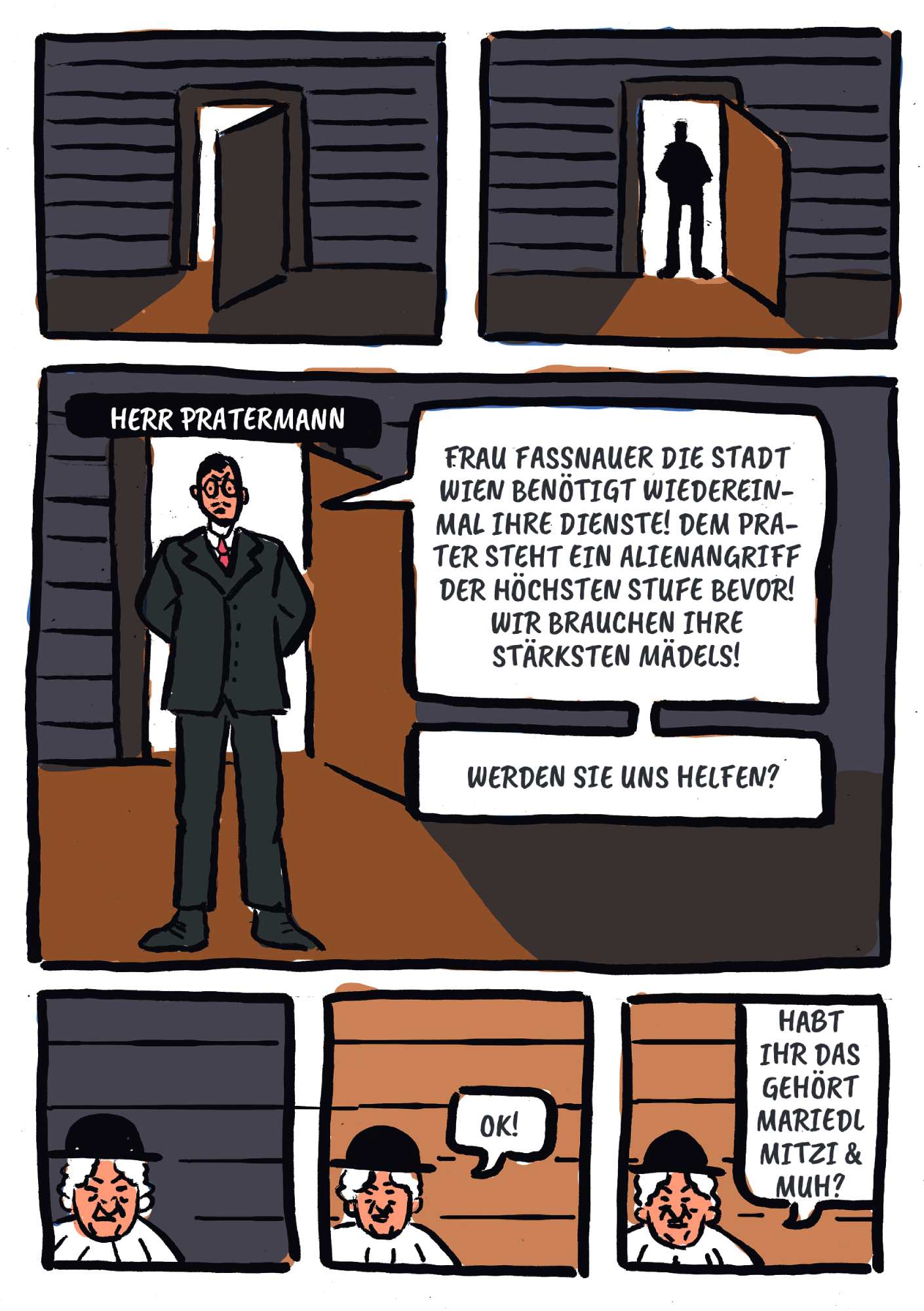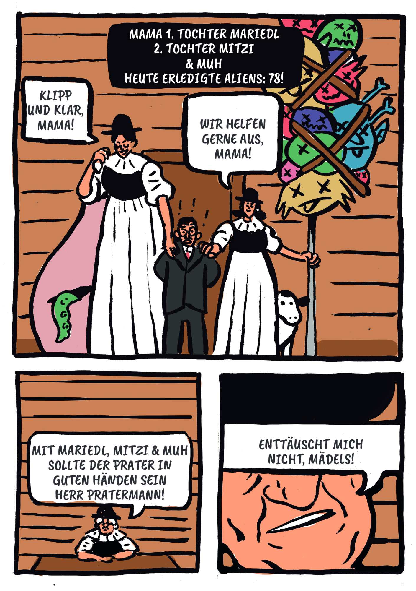 Dieser Comic entstand in Zusammenarbeit mit dem Pratermuseum. Dort wurden die Geschichte des Praters und seine zahlreichen Stars vorgestellt. Eine davon war die große Mariedl, über die ich mich entschieden habe, eine fiktive Geschichte zu erzählen.