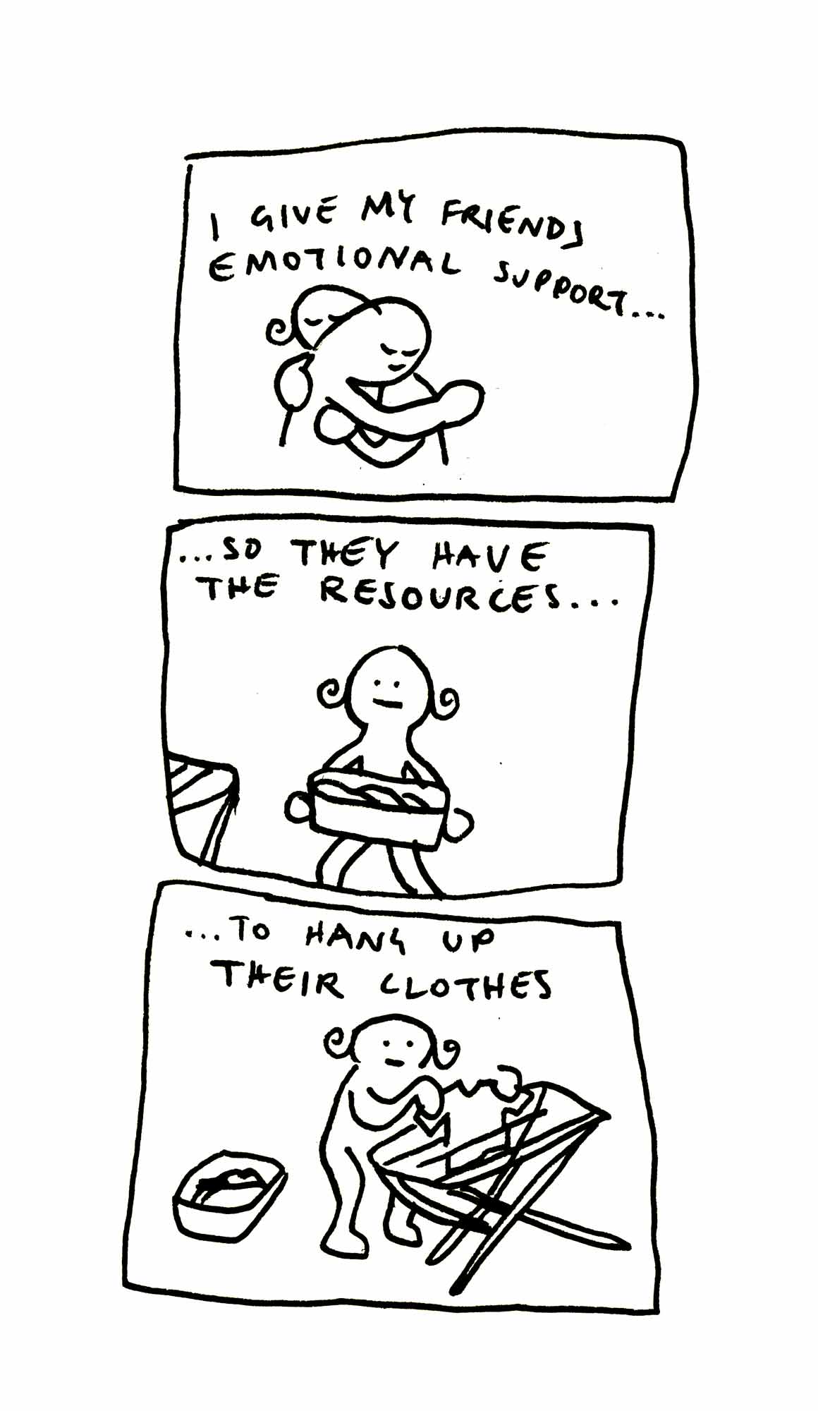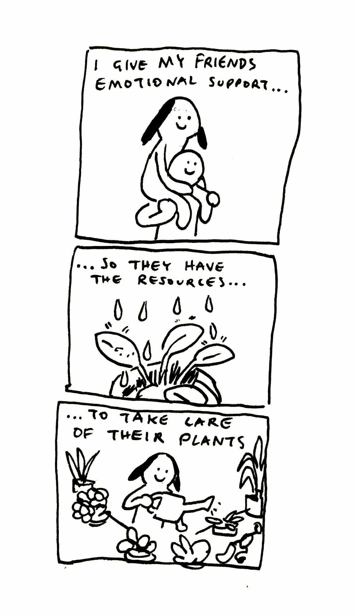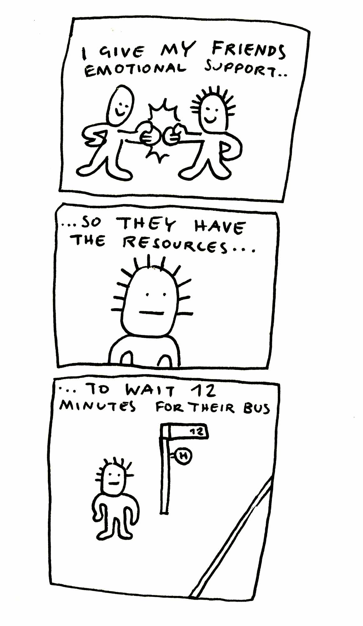 Diese Edition entstand, nachdem eine Freundin, die zu diesem Zeitpunkt schon länger Single war, anmerkte, dass in meinen Emotional Support Comics bisher vor allem verpartnerte Charaktere vorkamen. Deshalb habe ich den Fokus dieser Ausgabe bewusst auf Freundschaften gelegt.