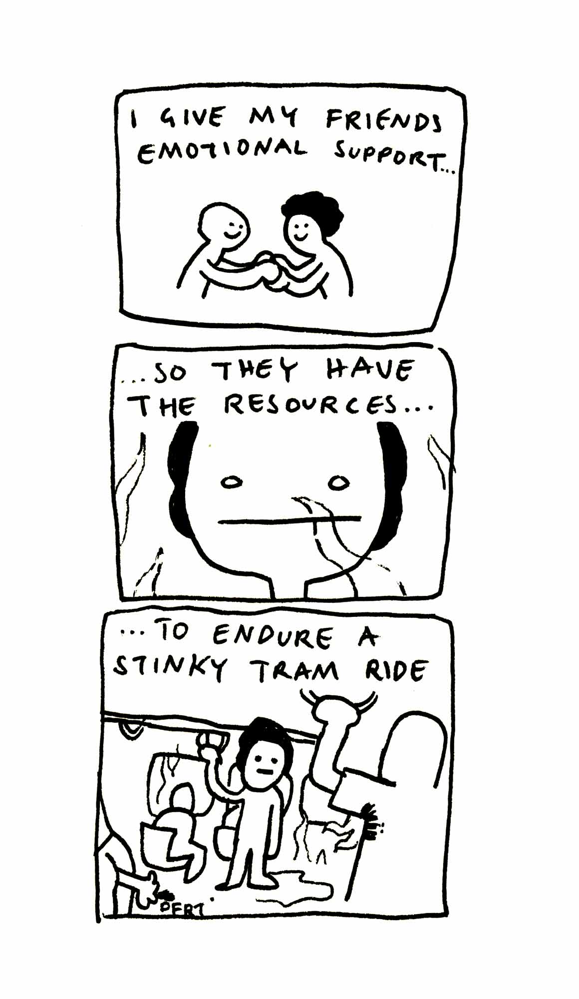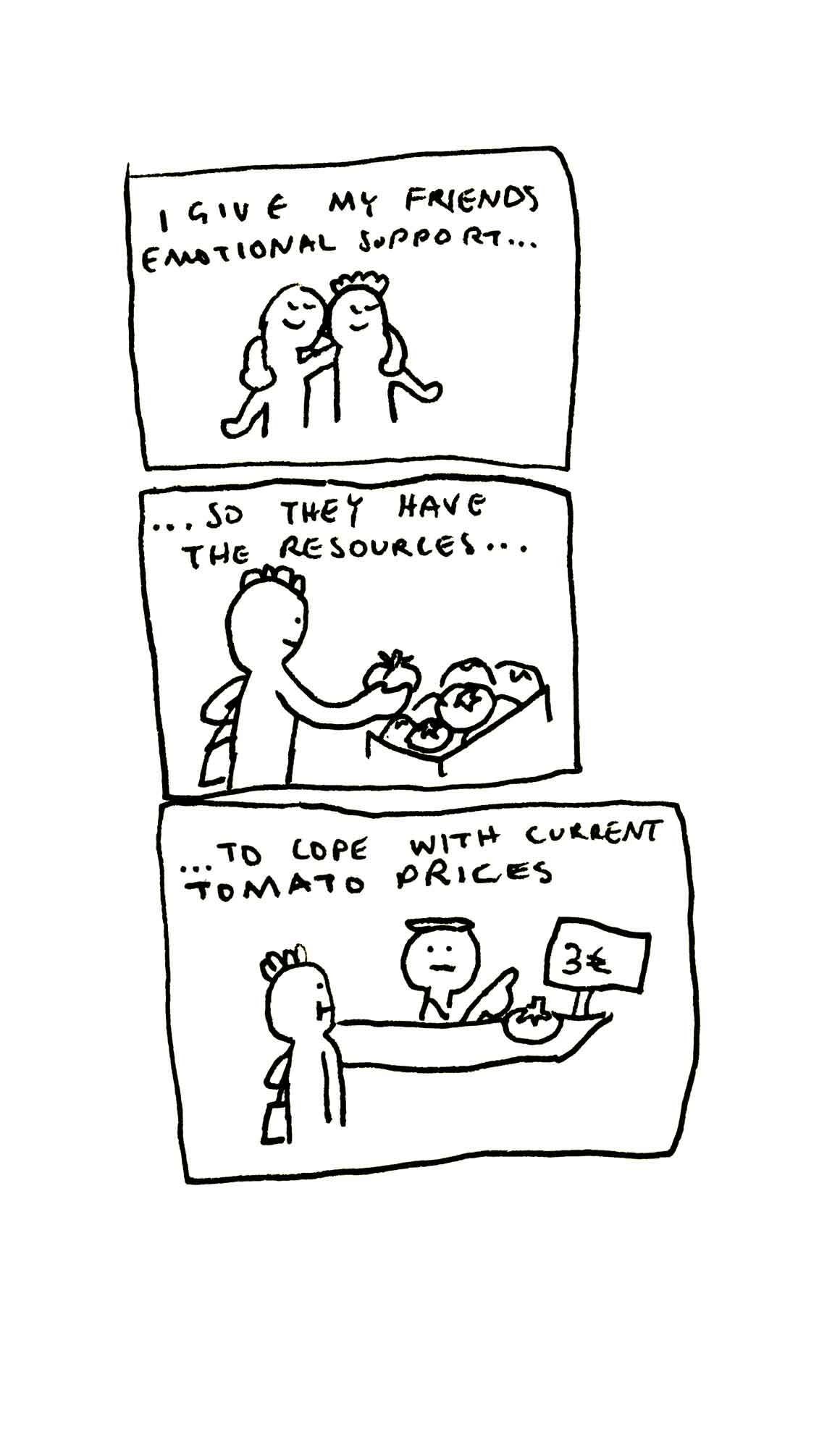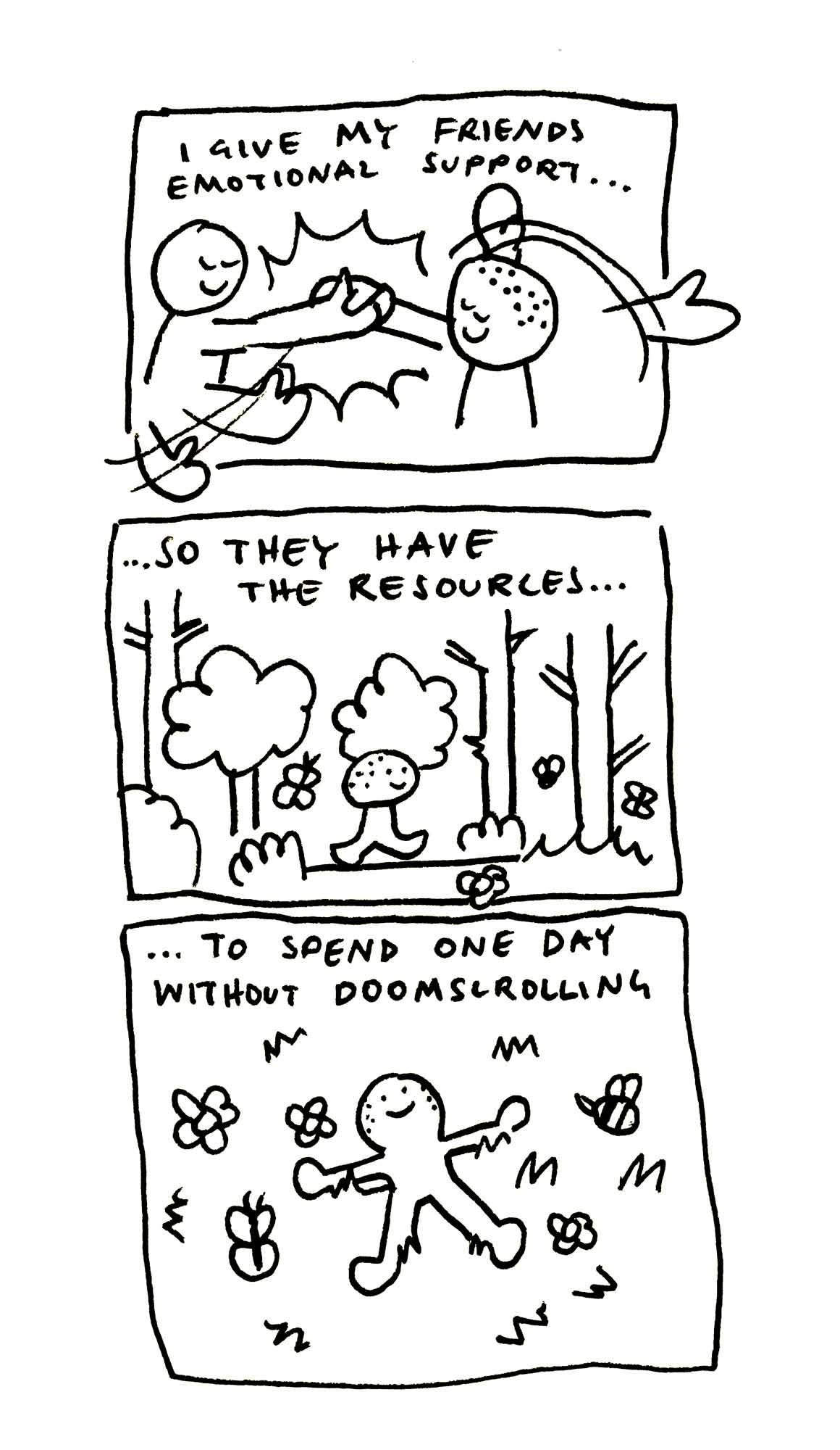 Diese Edition entstand, nachdem eine Freundin, die zu diesem Zeitpunkt schon länger Single war, anmerkte, dass in meinen Emotional Support Comics bisher vor allem verpartnerte Charaktere vorkamen. Deshalb habe ich den Fokus dieser Ausgabe bewusst auf Freundschaften gelegt.